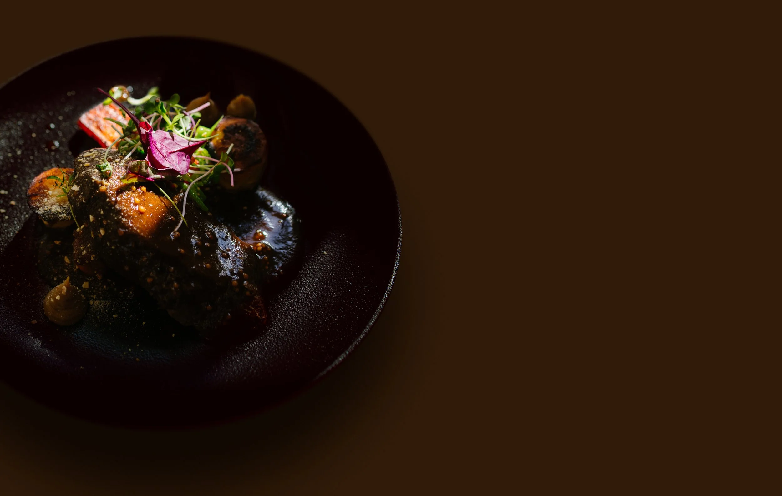 CELERIAC, BACON, CARROT MUSTARD, PLUM, OVEN-BAKED ONION, BLACK CURRANT AND MUSTARD SAUCE (L) (G)
